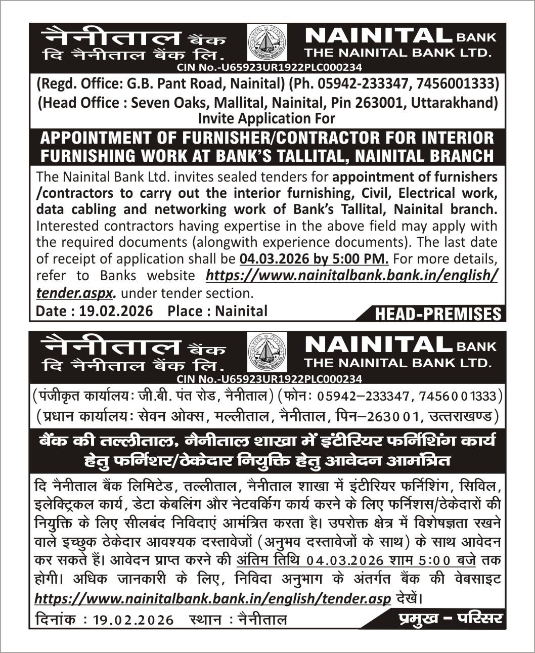 APPOINTMENT OF FURNISHER/CONTRACTOR FOR INTERIOR FURNISHING WORK AT BANK'S TALLITAL, NAINITAL BRANCHnew