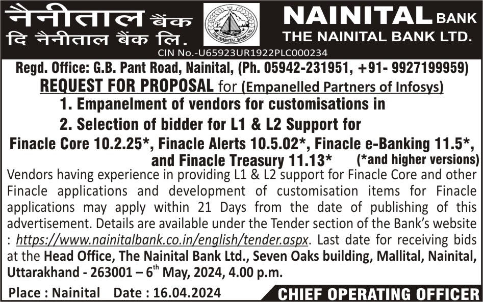 RFP for Empanelment of vendors for Customization of Finacle Core ver. 10.2.25 and higher versions, Finacle Alerts Solution ver. 10.5.02 and higher versions, Finacle e-Banking Solution (Retail and Corporate) ver. 11.5 and higher versions, and Finacle Treasury Solution ver. 11.13.0.8 and higher versions.